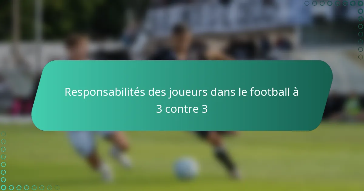 Comprendre les rôles spécifiques aux positions est crucial dans le football à 3. Chaque joueur doit connaître ses responsabilités, qu’il joue en tant qu’attaquant, milieu de terrain ou défenseur. Les entraîneurs doivent clarifier ces rôles pendant l’entraînement pour s’assurer que les joueurs peuvent s’adapter à diverses situations de jeu.